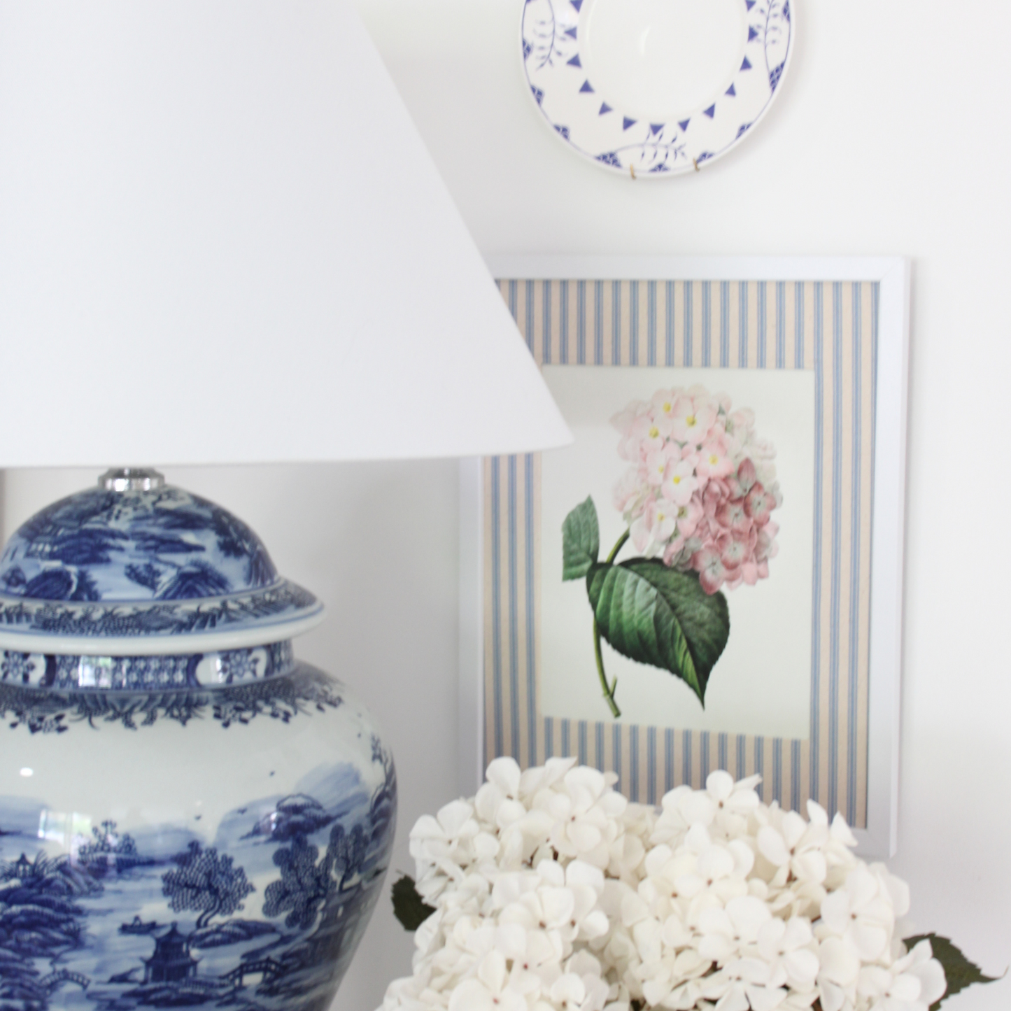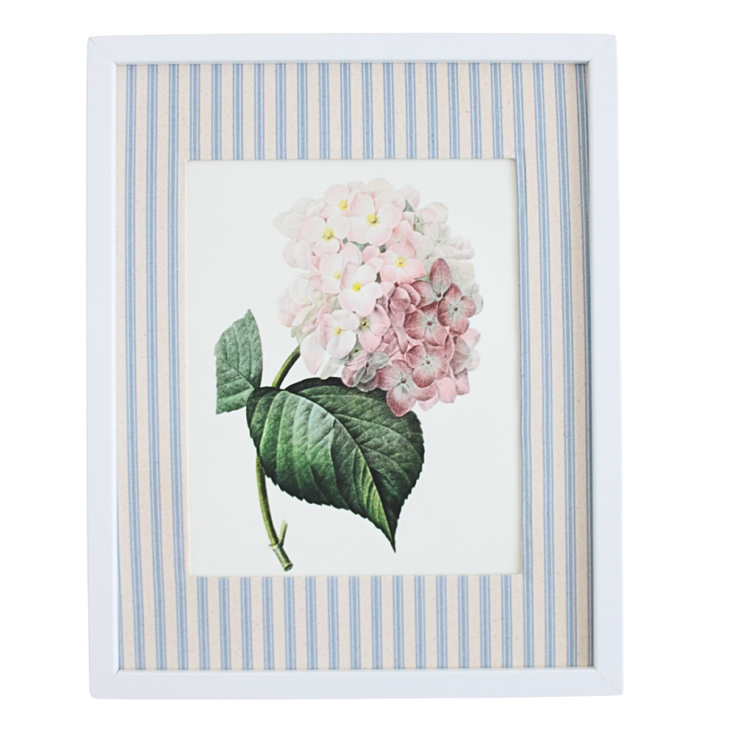 These botanical print fabric framed canvas prints, enhanced with a stunning blue and white striped inner frame, bring a distinctive charm to any home. Showcasing a hydrangea, they are the perfect addition to your decor, adding elegance and highlighting the beauty of your living space.