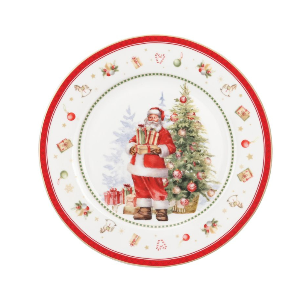 Adorned with a delightful scene of Santa Claus surrounded by a Christmas tree and presents, this plate is bound to bring smiles to your guests. Make your holiday dining extra special with this exclusive and charming addition.