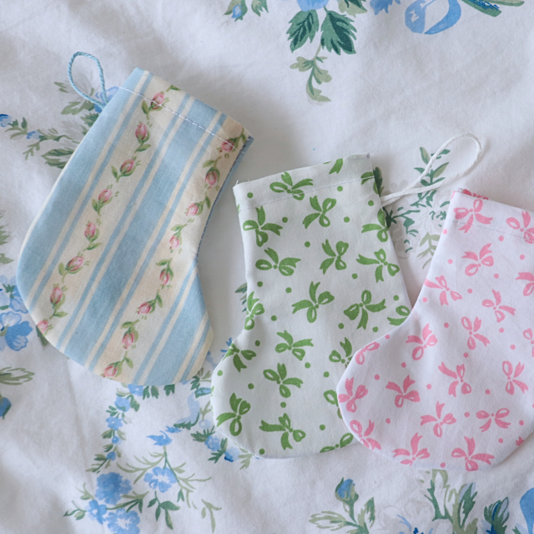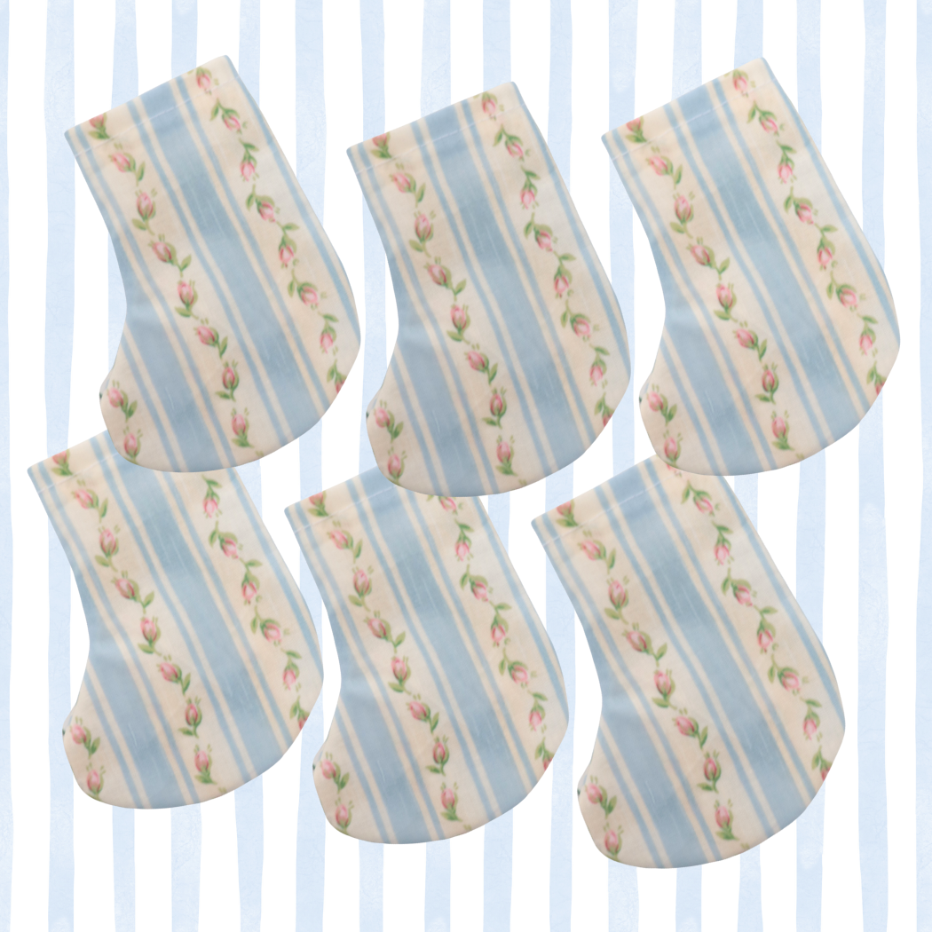 These charming mini stockings are expertly handsewn, featuring a pretty blue rose trellis pattern. Crafted from beautiful fabric and sized at 10cm by 8cm, they are ideal for gifting or adding a festive touch to your tree or mantle. Their versatile size makes them perfect for a variety of holiday decorations.