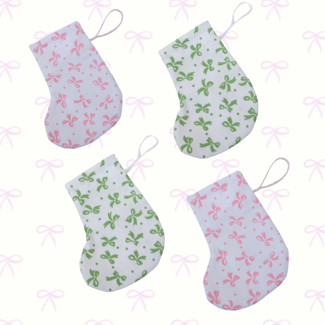 These charming mini stockings are expertly handsewn, featuring a stunning bow print on White. Crafted from beautiful fabric and sized at 10cm by 8cm, they are ideal for gifting or adding a festive touch to your tree or mantle. Their versatile size makes them perfect for a variety of holiday decorations.