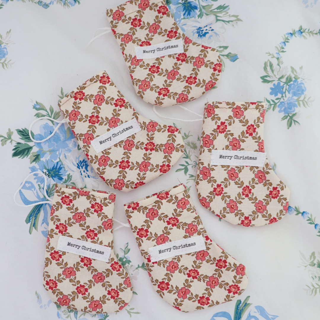 These charming mini stockings are expertly handsewn, featuring "Merry Christmas" on the front. Crafted from beautiful fabric and sized at 10cm by 8cm, they are ideal for gifting or adding a festive touch to your tree or mantle. Their versatile size makes them perfect for a variety of holiday decorations.
