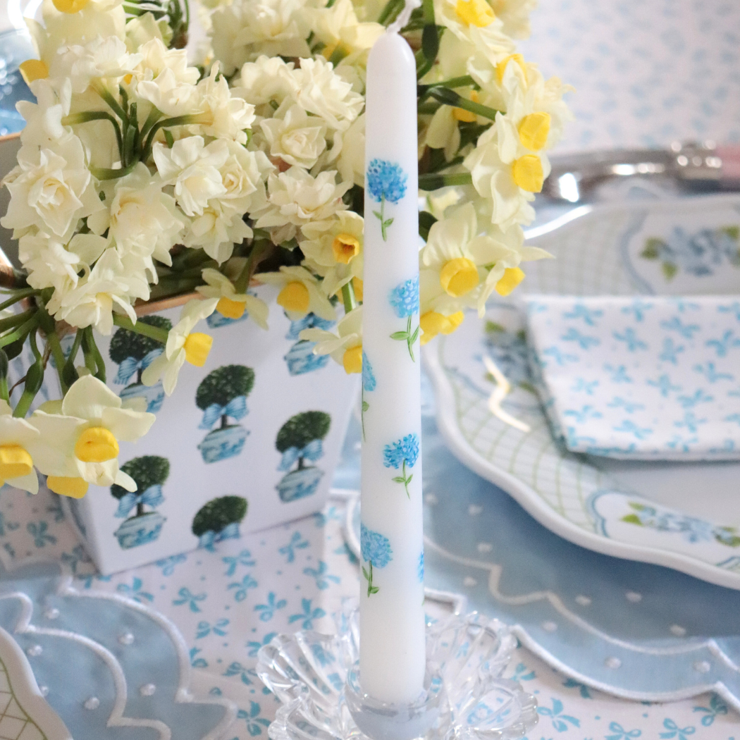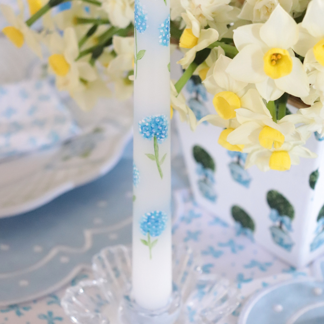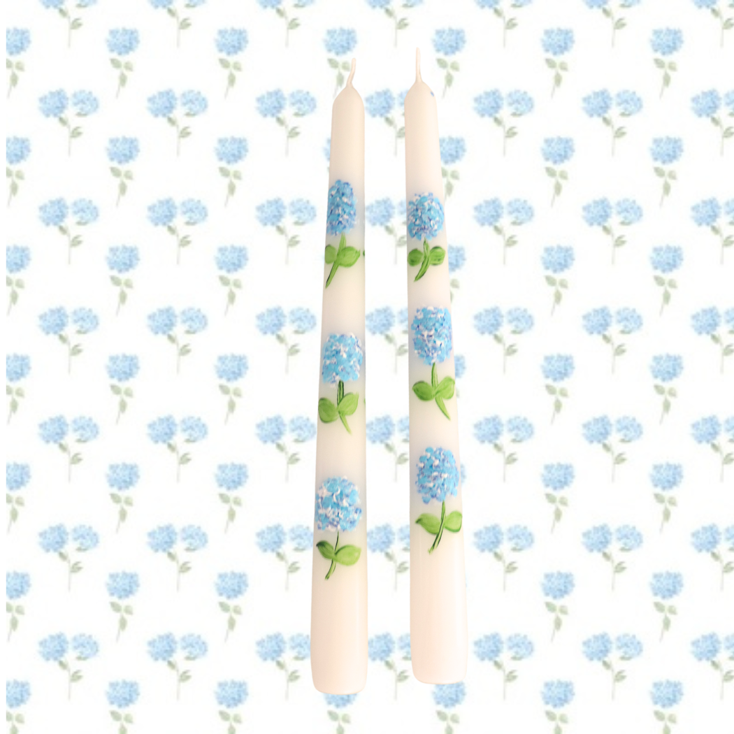 This white luxury candle, hand-painted with hydrangeas, is ideal for any elegant dinner setting. Each candle, crafted with artistic skill, features stunning blue hydrangeas.