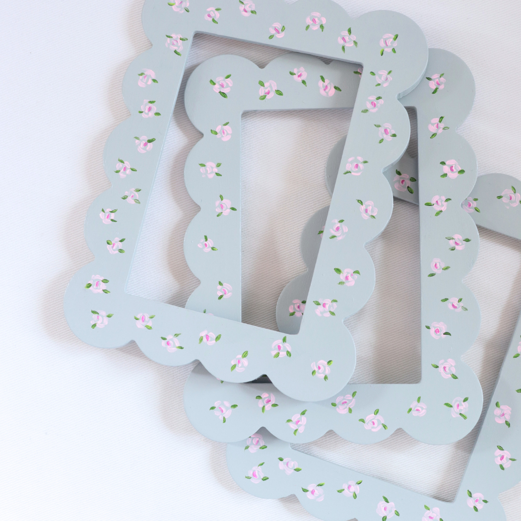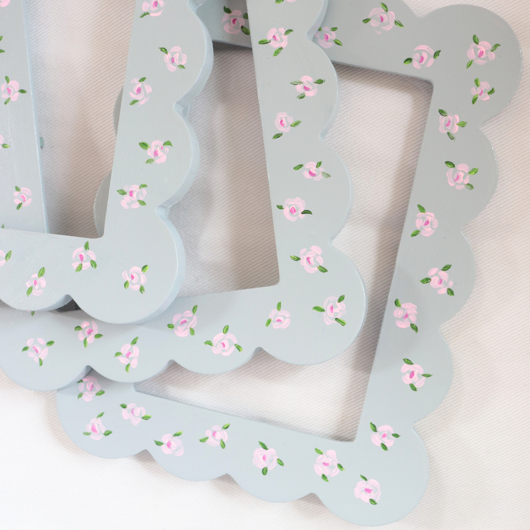 Expertly hand-painted, this duck egg blue scalloped frame showcases delicate pink roses cascading around its edges. Each frame is meticulously crafted, resulting in a one-of-a-kind and addition to your home or a perfect gift. Add your favorite photos or fabric for a truly lovely touch. This unique piece is painted with acrylic mat paints and finished with a glossy protective coating in my Melbourne home studio. Measuring 20cm in length and 15cm in width, it fits a 4 x 6 photo.