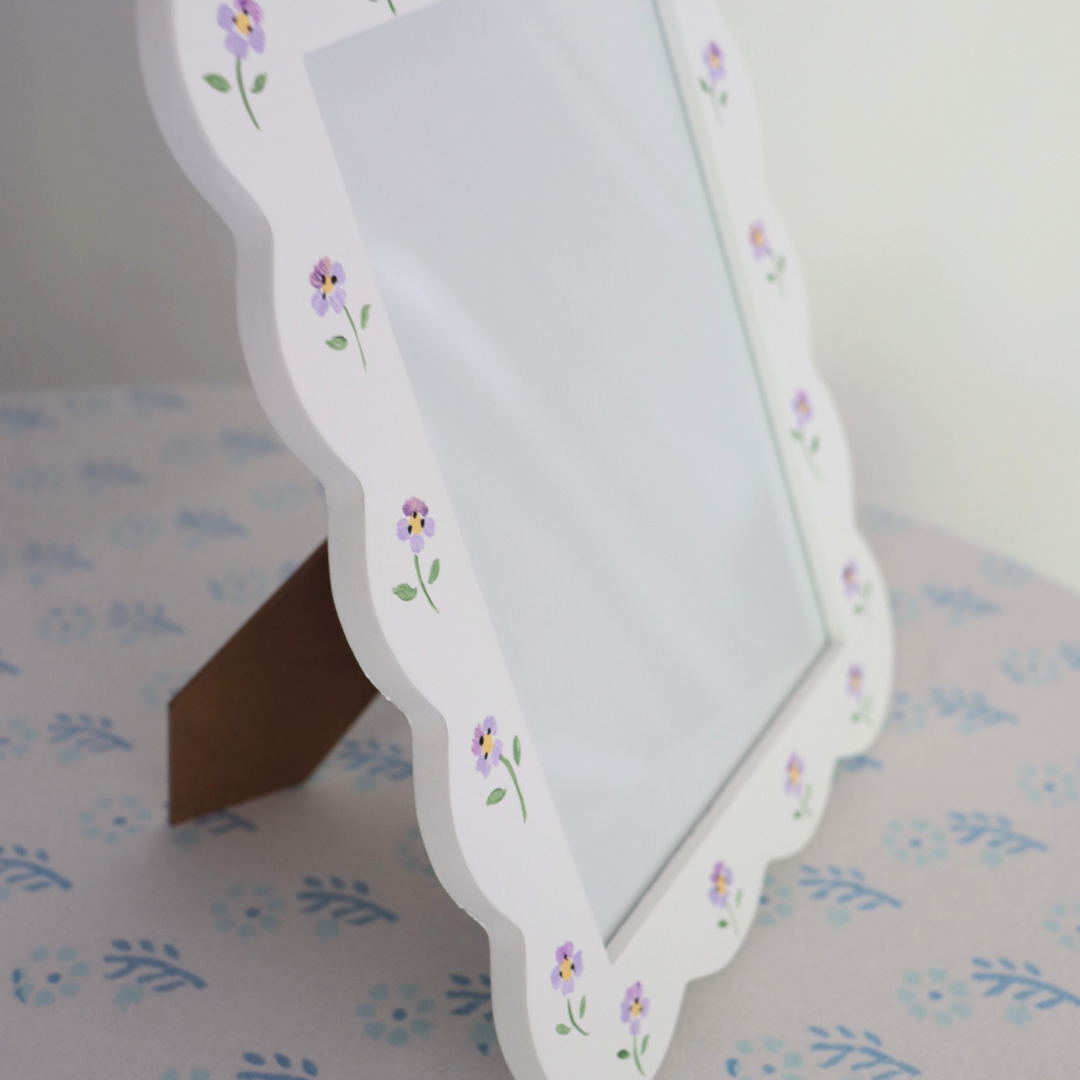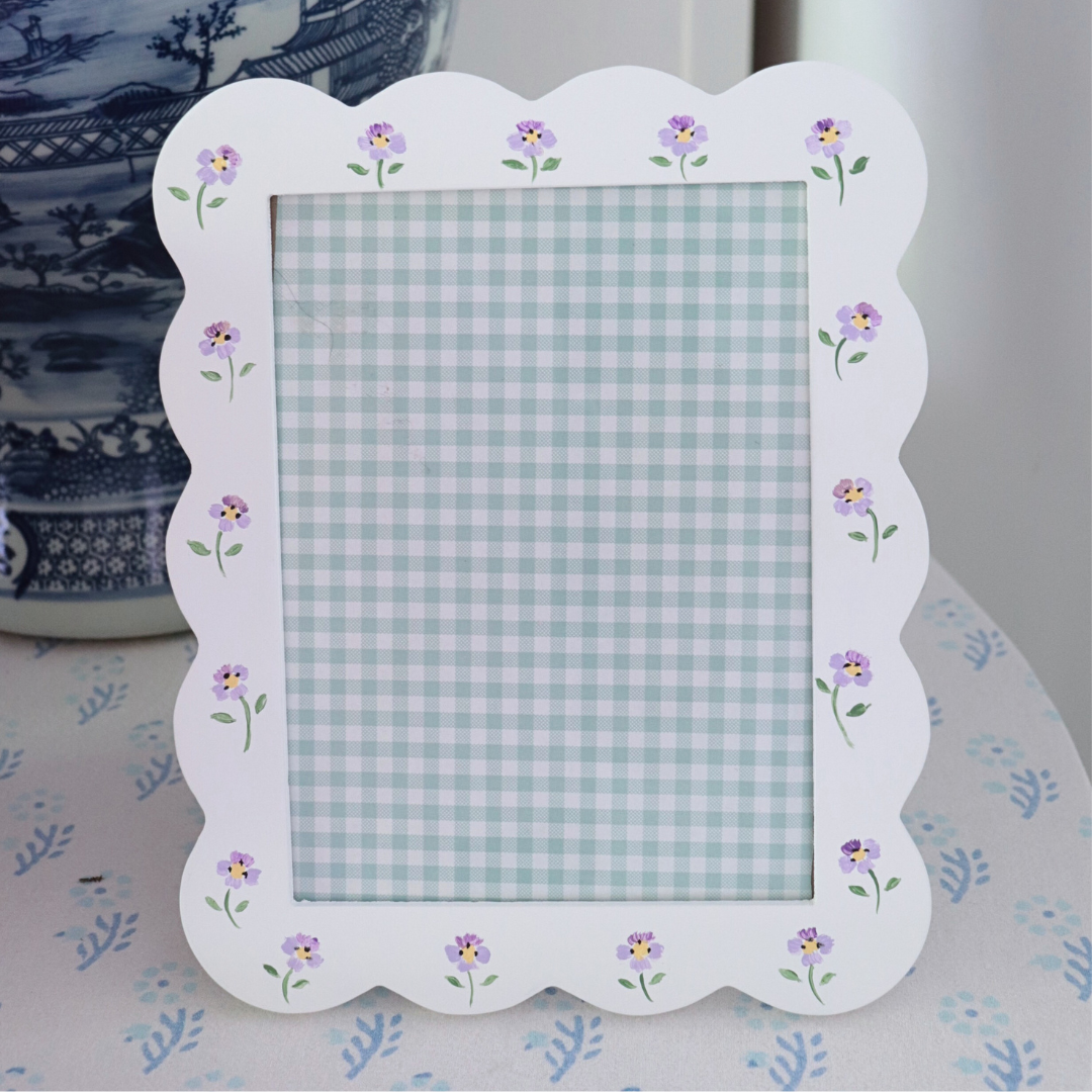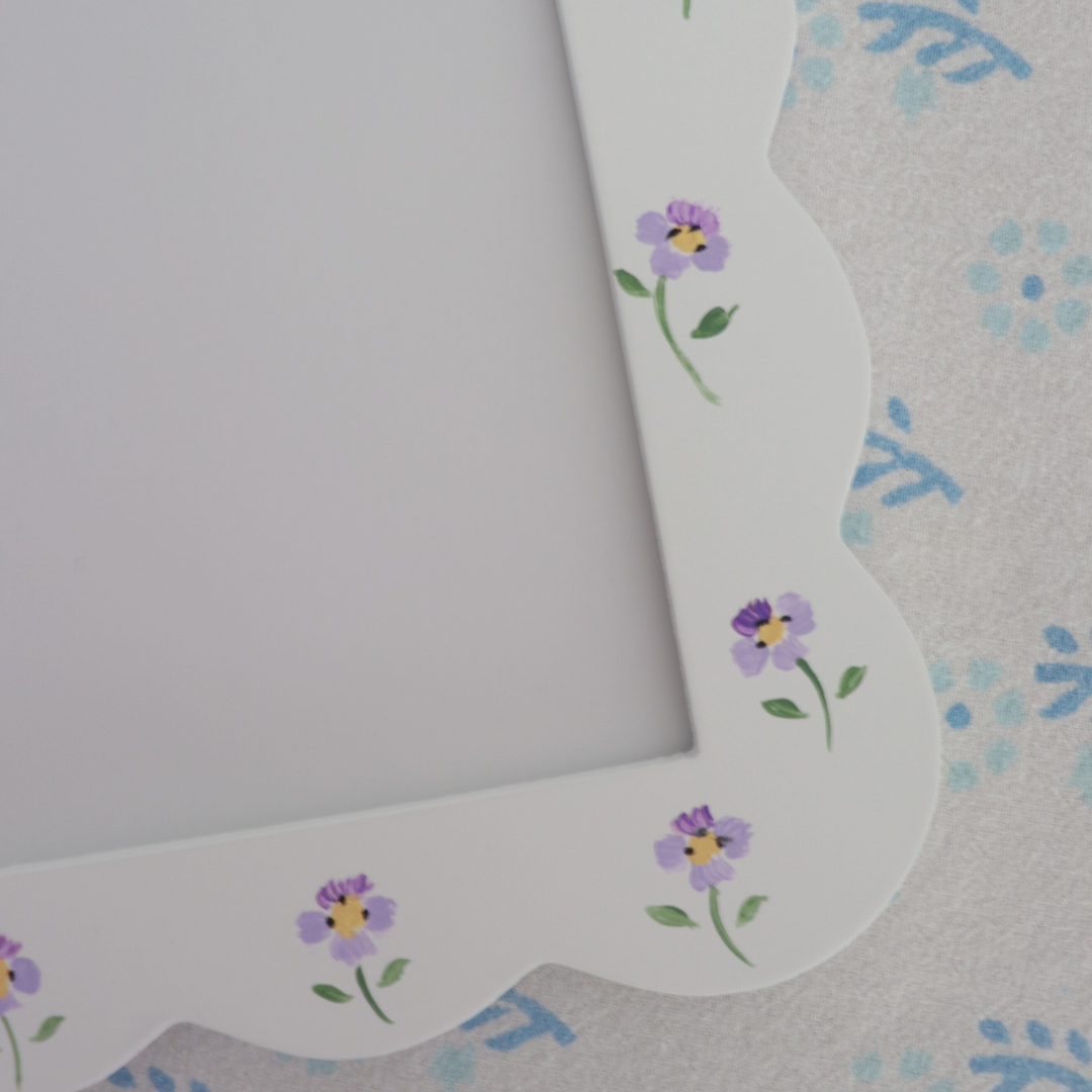 Expertly hand-painted, white scalloped frame showcases delicate pansies cascading around its edges. Each frame is meticulously crafted, resulting in a one-of-a-kind and stunning addition to your home or a perfect gift. Add your favorite photos or fabric for a truly lovely touch. This unique piece is painted with acrylic mat paints and finished with a glossy protective coating in my Melbourne home studio. Measuring 20cm x 25cm, it fits a 6 x 8 photo.