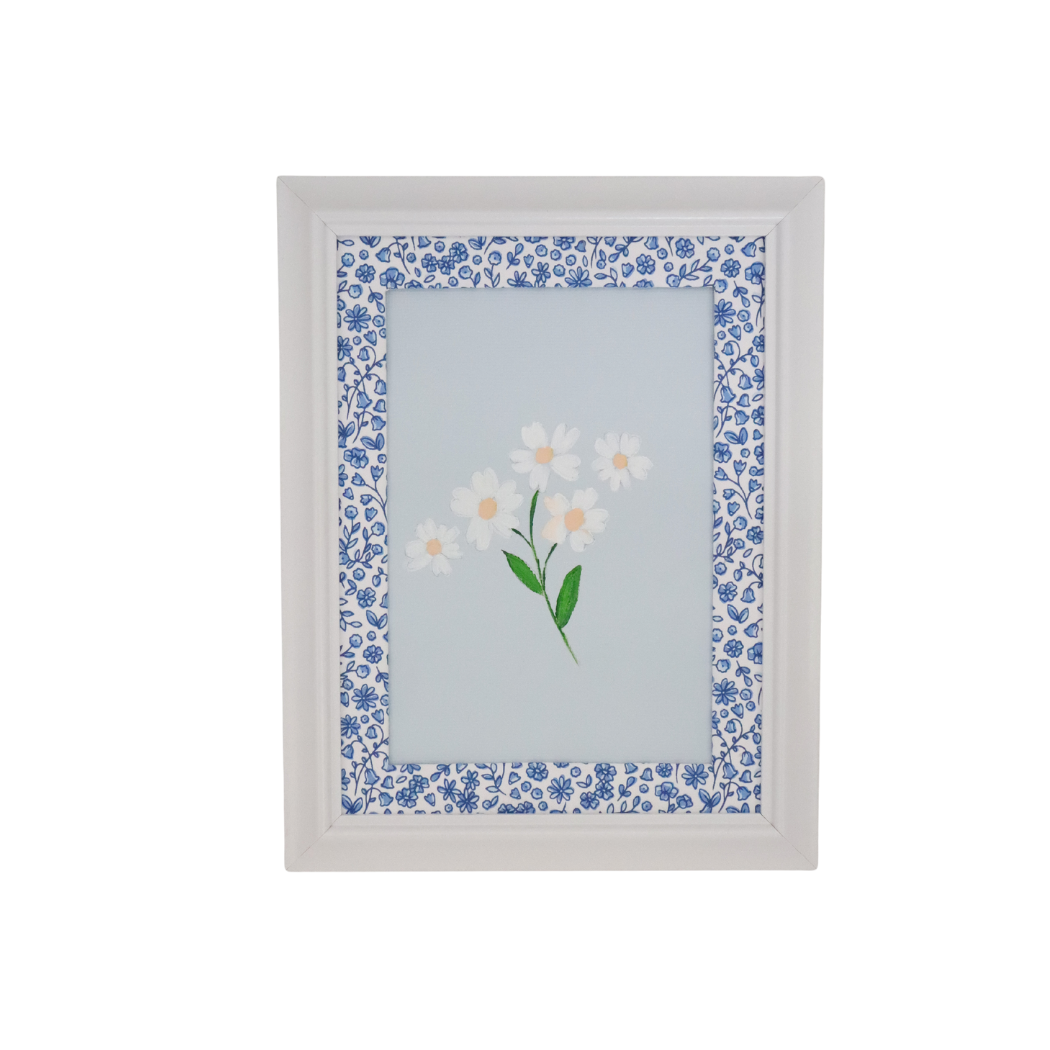 Original hand painted daisy artwork. Each piece is lovingly painted in my Melbourne home studio on durable light blue cardstock and painted using pale acrylics. The elegant inner frame is accented with decoupage paper, adding a touch of charm to the edge. Measures 24cm x 18cm white wooden frame and signed on the back. This is a one-of-a-kind piece!