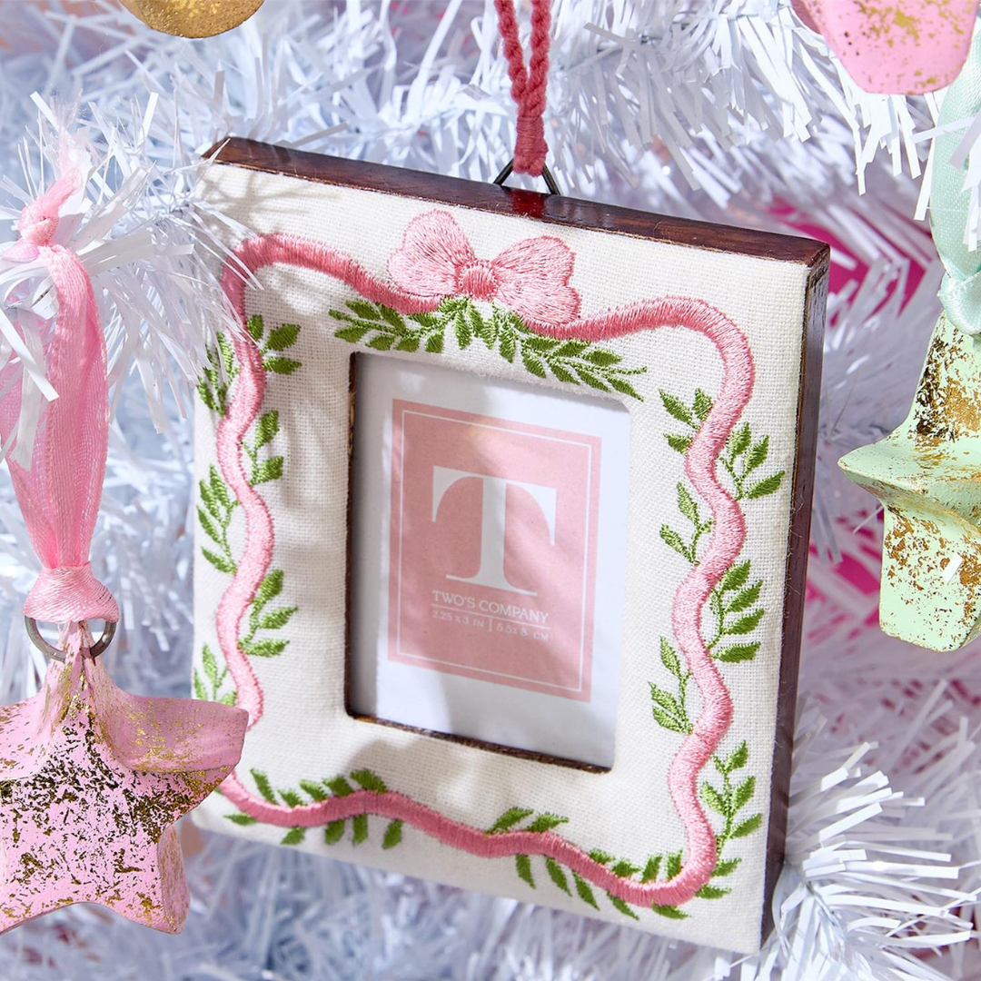 These charming hanging frames feature delicate embroidered details that add a decorative touch to any space. Designed to showcase a small photo or keepsake, each frame is finished with a coordinating ribbon for easy hanging, making them a lovely addition to a tree, wreath, or wall display.