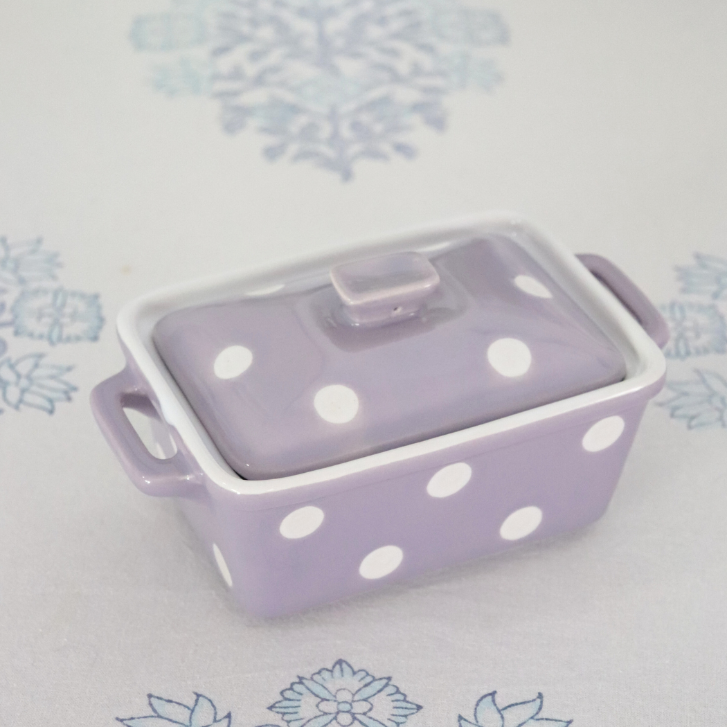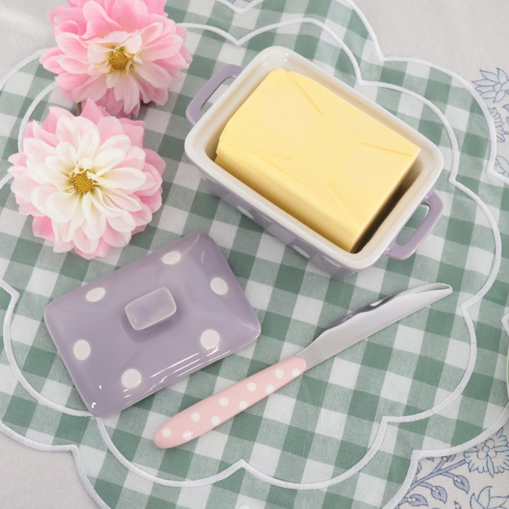 Limited edition* Introducing our exquisite lilac butter dish, perfect for elevating your dining experience. Crafted from premium porcelain and adorned with charming polka dots, this dish not only adds a touch of elegance but also keeps your butter fresh and easily accessible. Complete your table setting with this beautiful addition.